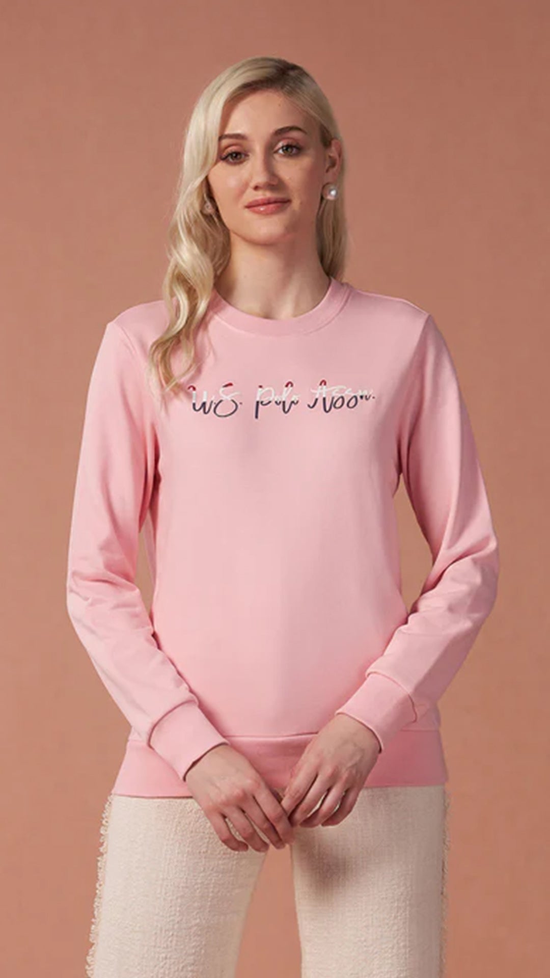 Solid Pink, Brand Printed Drop Shoulder No Casual Crew-neck Sweatshirt Cotton & Polyester Sweatshirt Slip on |